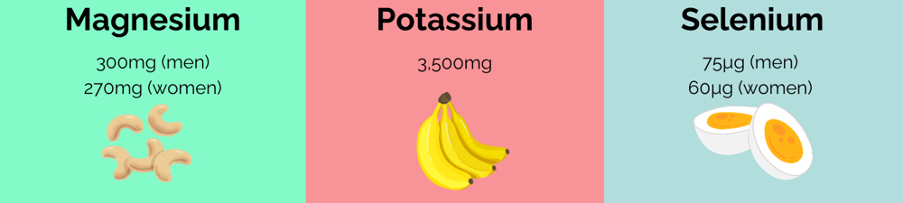 Too much potassium (> 3,700mg/day) can lead to symptoms of sickness, diarrhoea, and stomach pain.